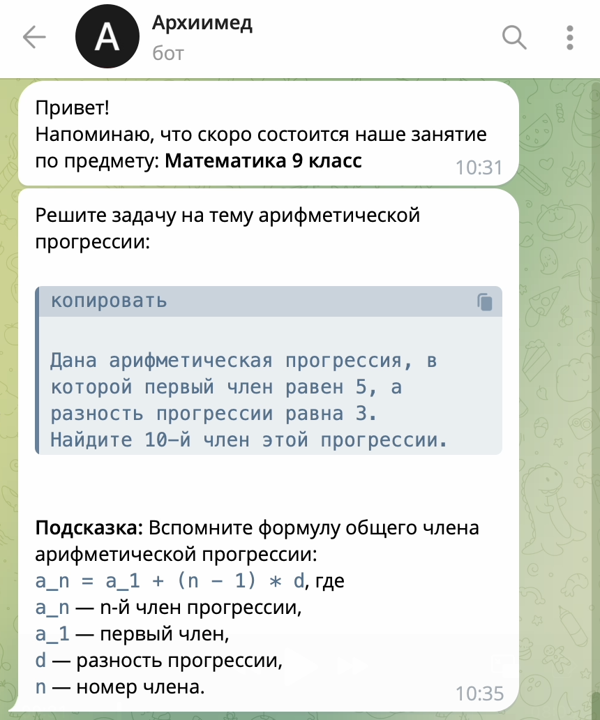 Архиимед присылает упражнения и проводит занятия в выбранное время. Занятие всегда можно отменить или перенести.